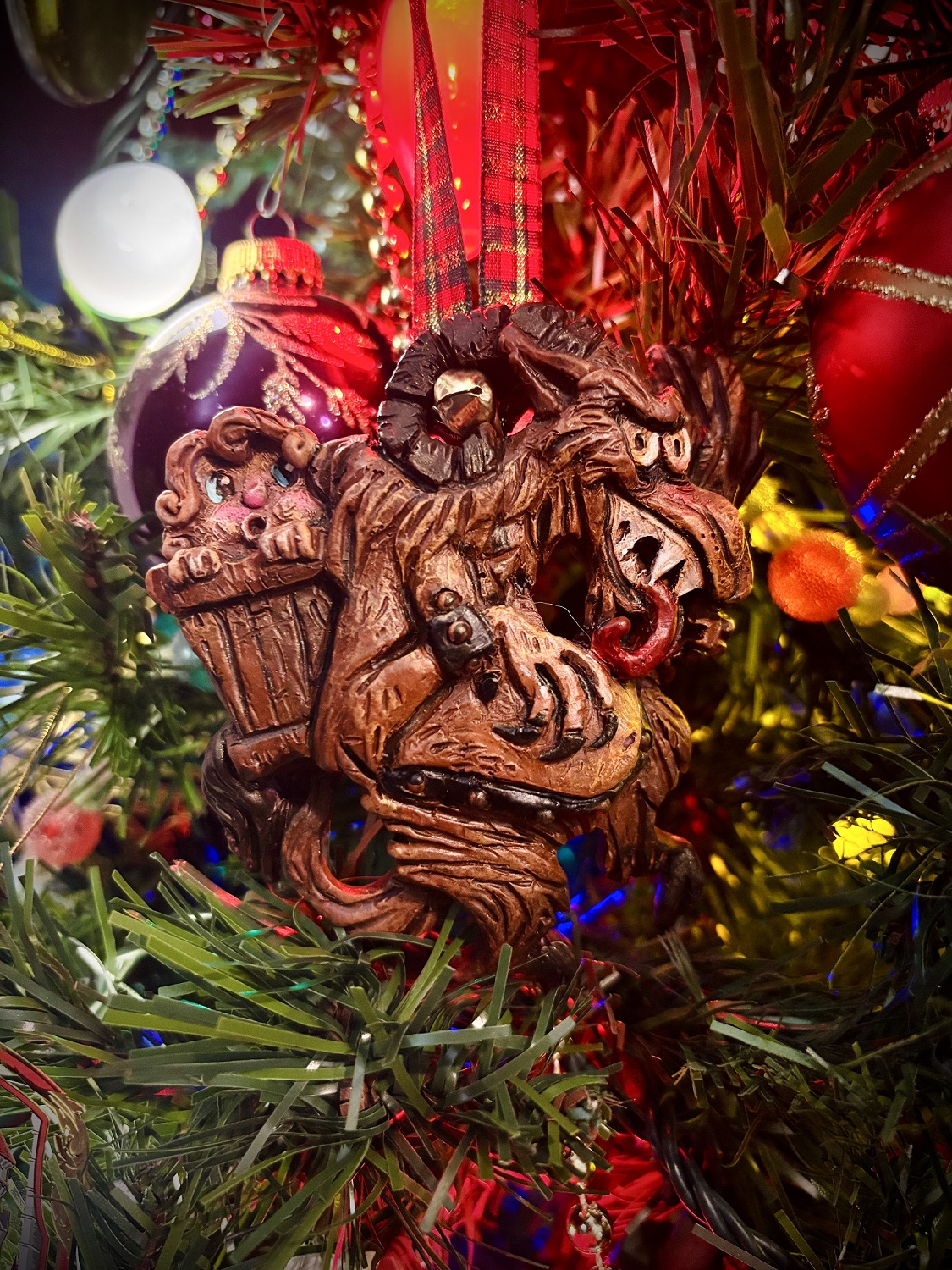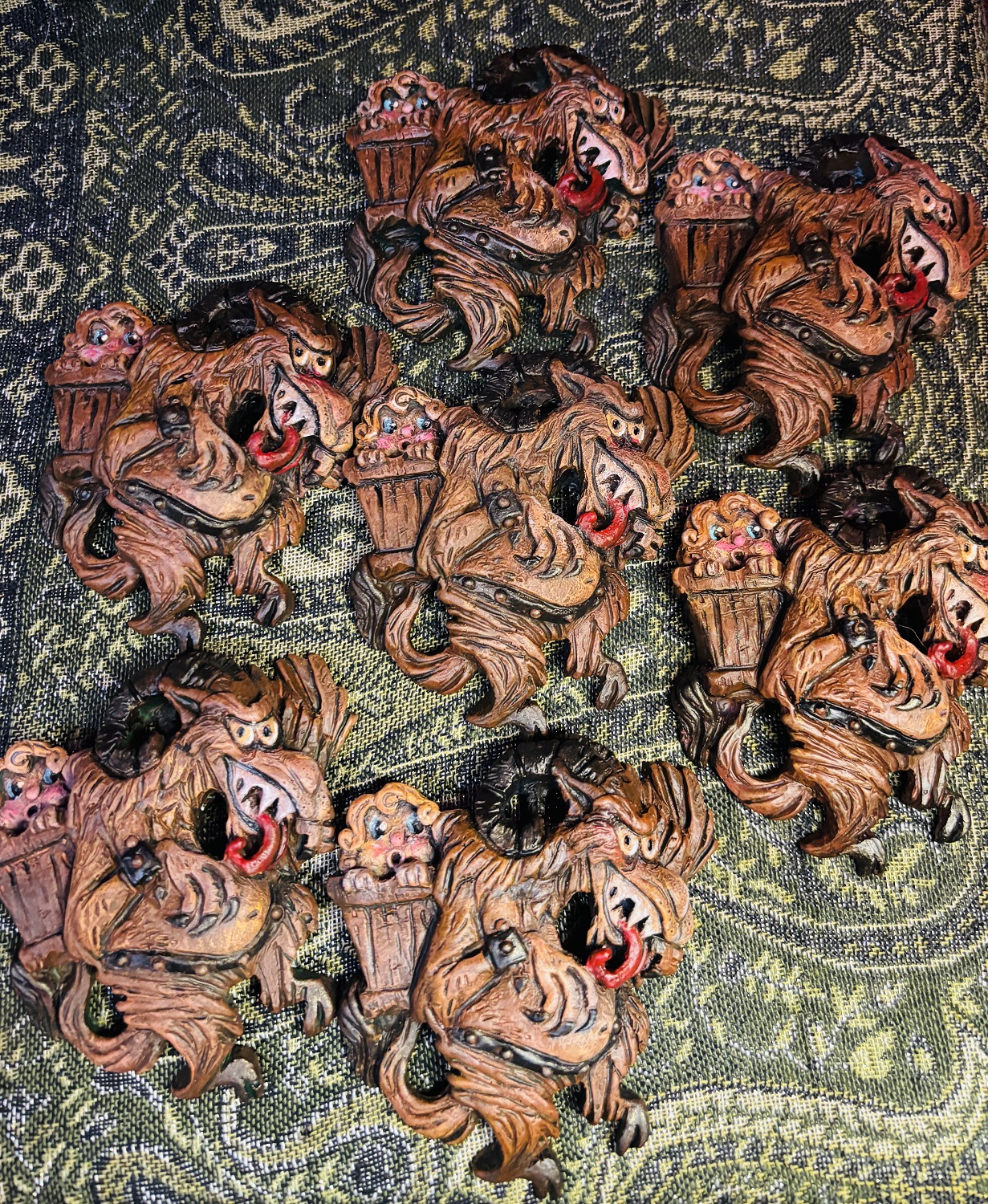 cast in resin and hand painted with acrylics, going for an old timey woodcut look with these, but the paint job may vary